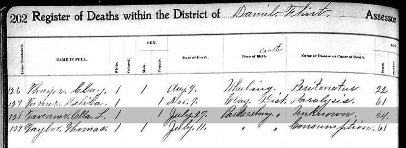 Register of Deaths Book, Wood County, West Virginia Page 202, Line 128 (left side) - Name: Tavenner, Ella L.; Date of Death: 27 July 1900; Place of Death: Parkersburg District; Cause of Death: Not known; Age: 54 years |