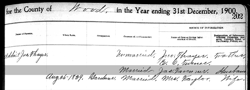 Register of Deaths Book, Wood County, West Virginia Page 202, Line 128 (right side) - Name of Parents: not listed; Where Born: not listed; Status: Married; Source of Information: Jas Tavenner, Husband |