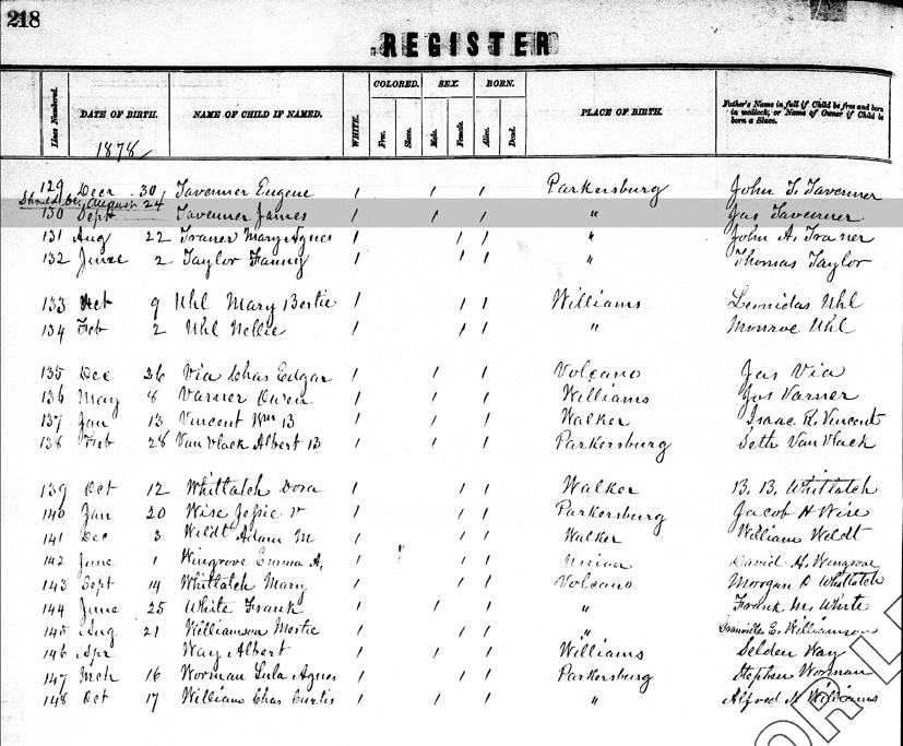Register of Births Book, Wood County, West Virginia Page 218, Line 130 (left side) - Date: 24 Aug 1878; Name of child: James Tavenner; Place: Parkersburg; Name of father: James Tavenner |