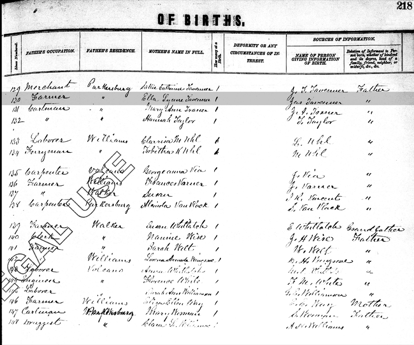 Register of Births Book, Wood County, West Virginia Page 218, Line 130 (right side) - Lists occupation of father: Farmer; Residence: Parkersburg; Name of mother: Ella Lynn Tavenner; Number at birth: 1; Person providing information: Jas. Tavenner, Father |
