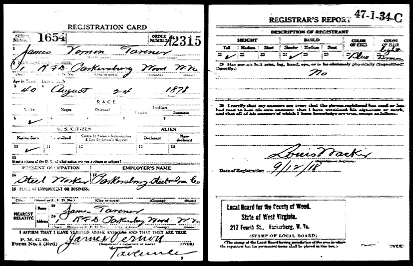 World War I - Military Registration Card Draft Card of James Vernon Tavenner. |