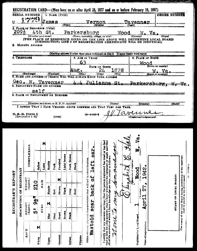 World War II - Military Registration Card Registration Card of James Vernon Tavenner. |