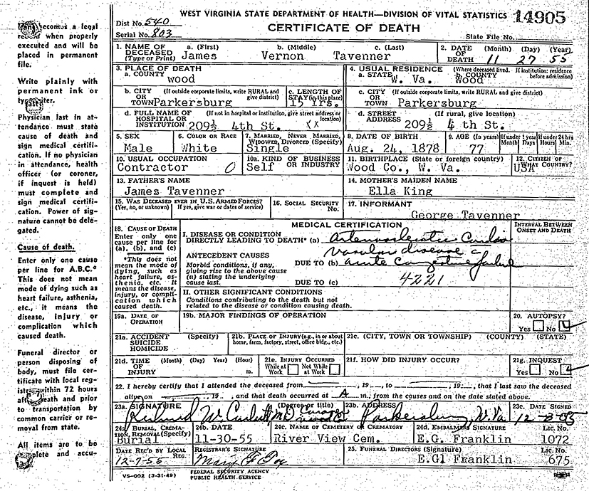 Original Certificate of Death, Wood County, West Virginia (Image contributed by Lois Rose) |