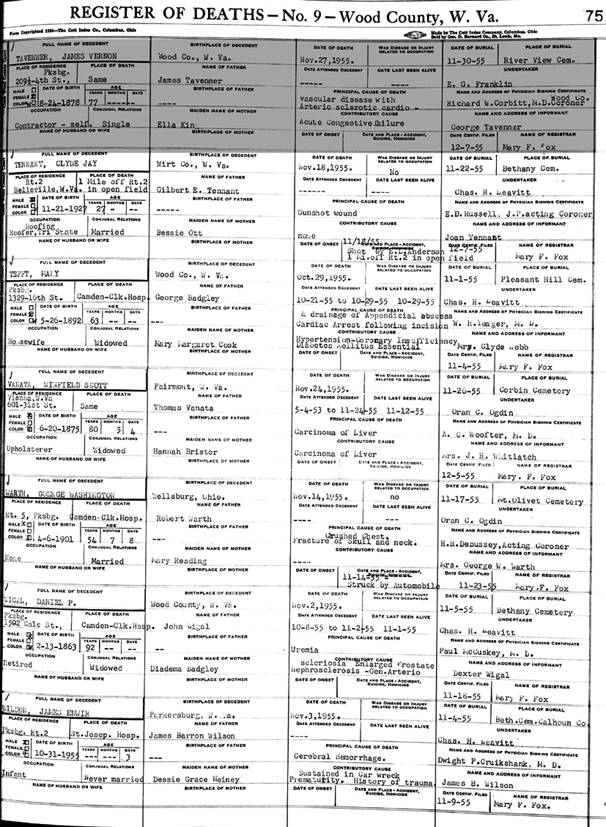 Register of Deaths Book – No. 9, Wood County, West Virginia Before this image was available, the information on the page was previously copied directly from the book by Teresa Fordyce, and forwarded to me by e-mail. See the "Notes" section for that information. |