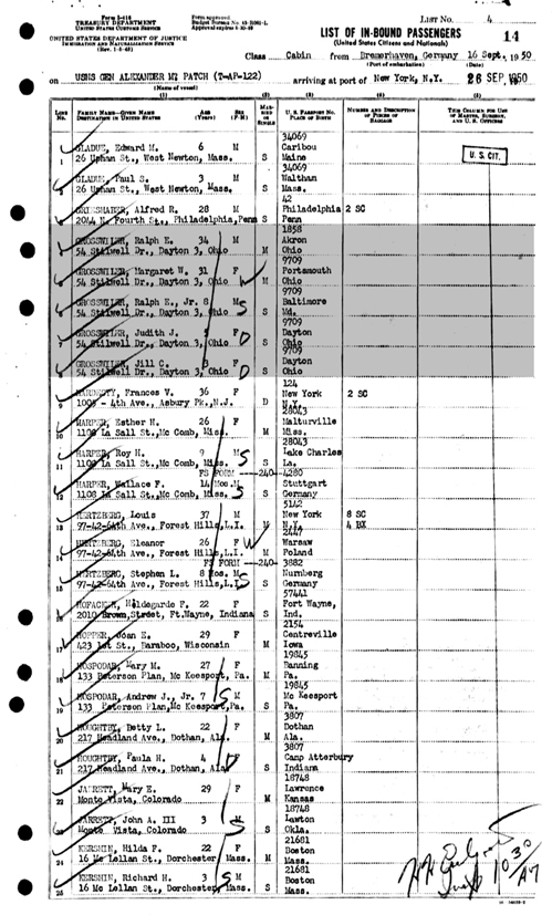 Ralph E and Margaret Grosswiler with children Ralph, Judith and (Jill) Joy, listed in the Cabin Class of the USNS "Gen. Alexander M. Patch". Departing Bremerhaven, Germany, 16 September 1950 and arriving in Port of New York, 26 September 1950.