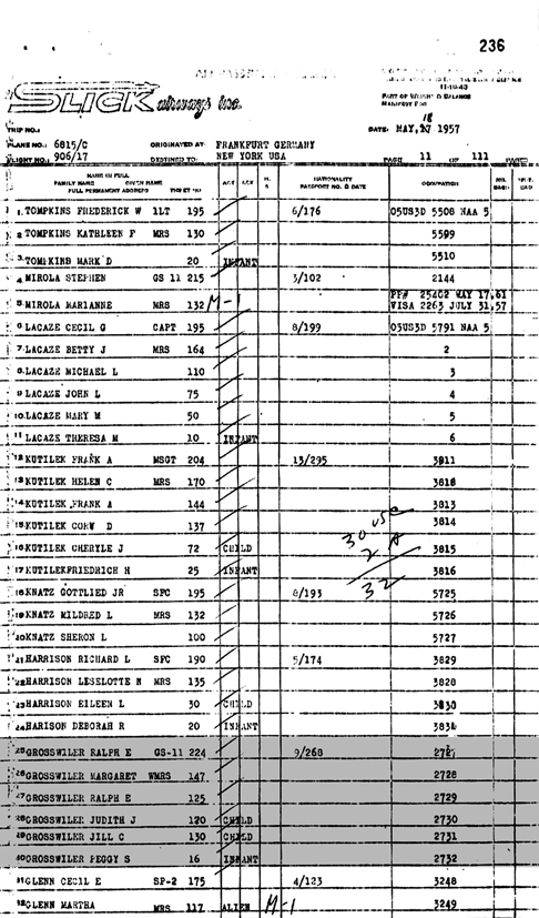 Ralph E and Margaret W. Grosswiler with children Ralph, Judith, Jill and Peggy, listed on Flight No..906/17. Originating at Frankfurt, Germany and arriving in New York. Dated 18 May 1957.