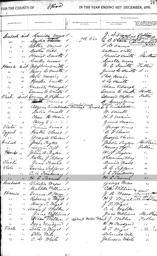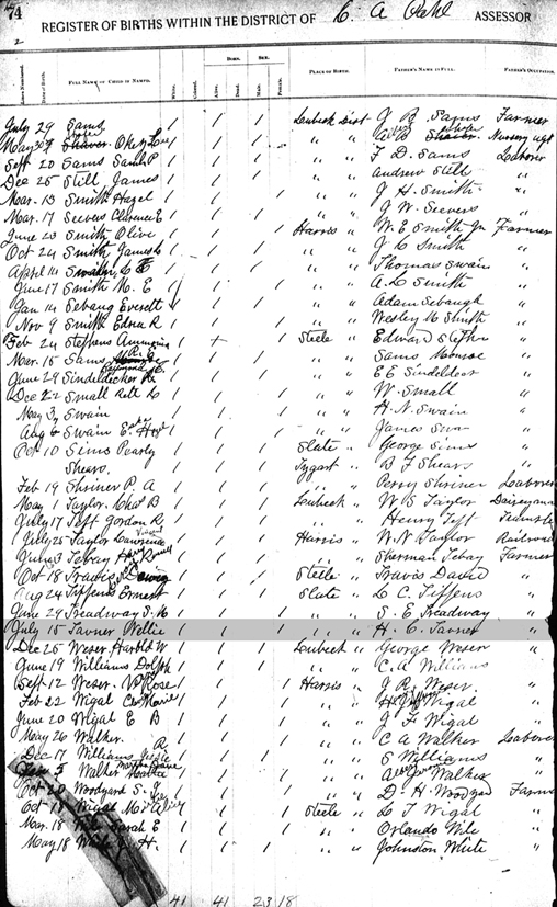 Register of Births Book, Wood County, West Virginia Page 74 (left side) - Date of Birth: 15 Jul 1898; Name of child: Nellie Tavenner; Place: Slate District; Name of father: H. C. Tavenner; Occupation: Farmer |