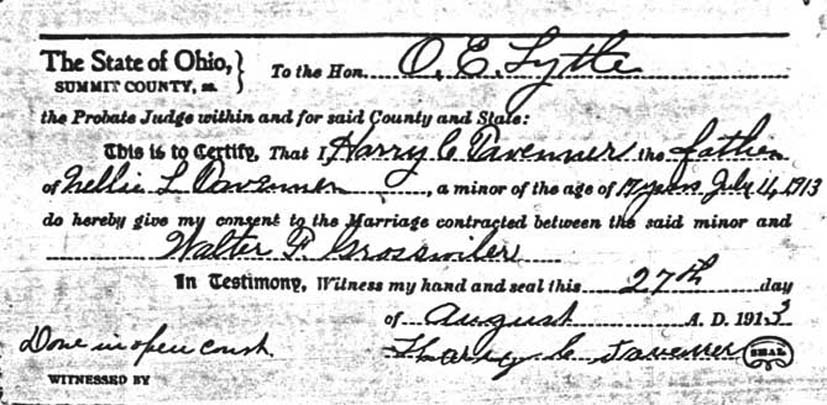 Marriage Consent Form Dated 27 Aug 1913. Scanned copy received from Harry Fox, Ohio |
