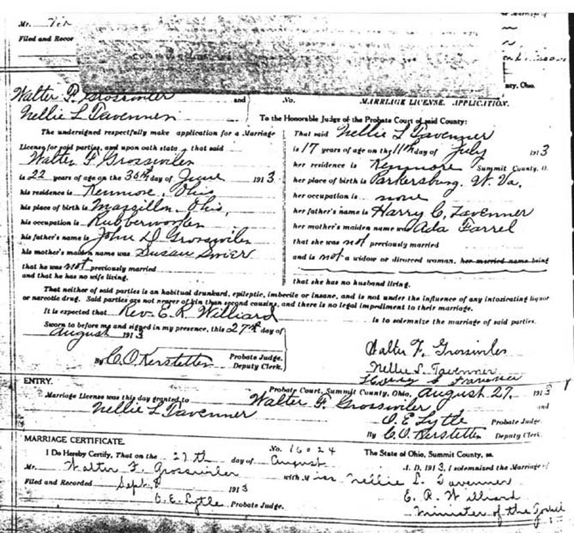 Marriage Certificate (1st Marriage) Dated 27 Aug 1913. Scanned copy received from Harry Fox, Ohio |