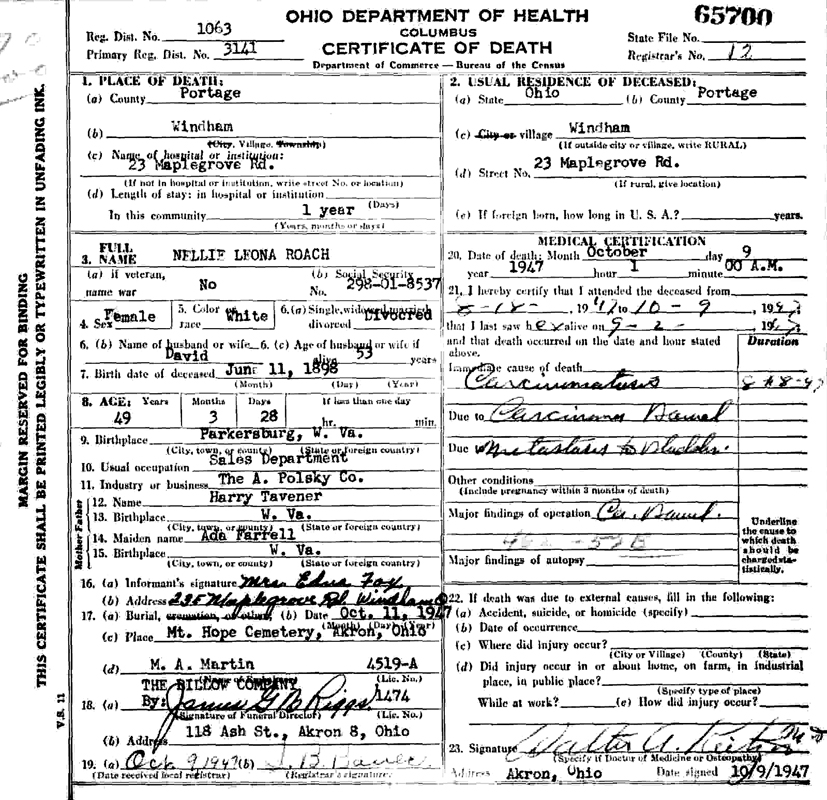 Original Certificate of Death, Portage County, Ohio Death Certificate of Nellie Leona (Tavenner) Roach. Image found on http://search.labs.familysearch.org/recordsearch/ |