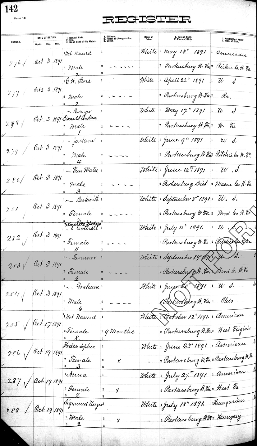 Register of Births Book, Wood County, West Virginia Page 142-143, Line 283 (left side) - Date of Record: 3 Oct 1891; Name of Child: - - - Tavenner; Number of Children to this Mother: 2; Sex: Female; Date of Birth: 19 Sep 1891; Place of Birth: Parkersburg, West Virginia |