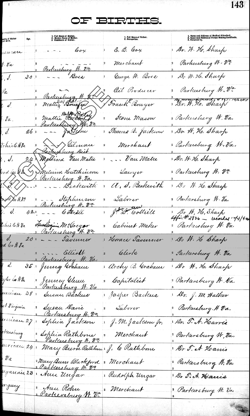 Register of Births Book, Wood County, West Virginia Page 142-143, Line 283 (right side) - Name of Mother: - - - Tavenner; Maiden Name of Mother: - - - Elliott; Residence of Mother: Parkersburg, West Virginia; Name and Occupation of Father: Horace Tavenner, Clerk; Name of Medical Attendant: Dr. W. H. Sharp |