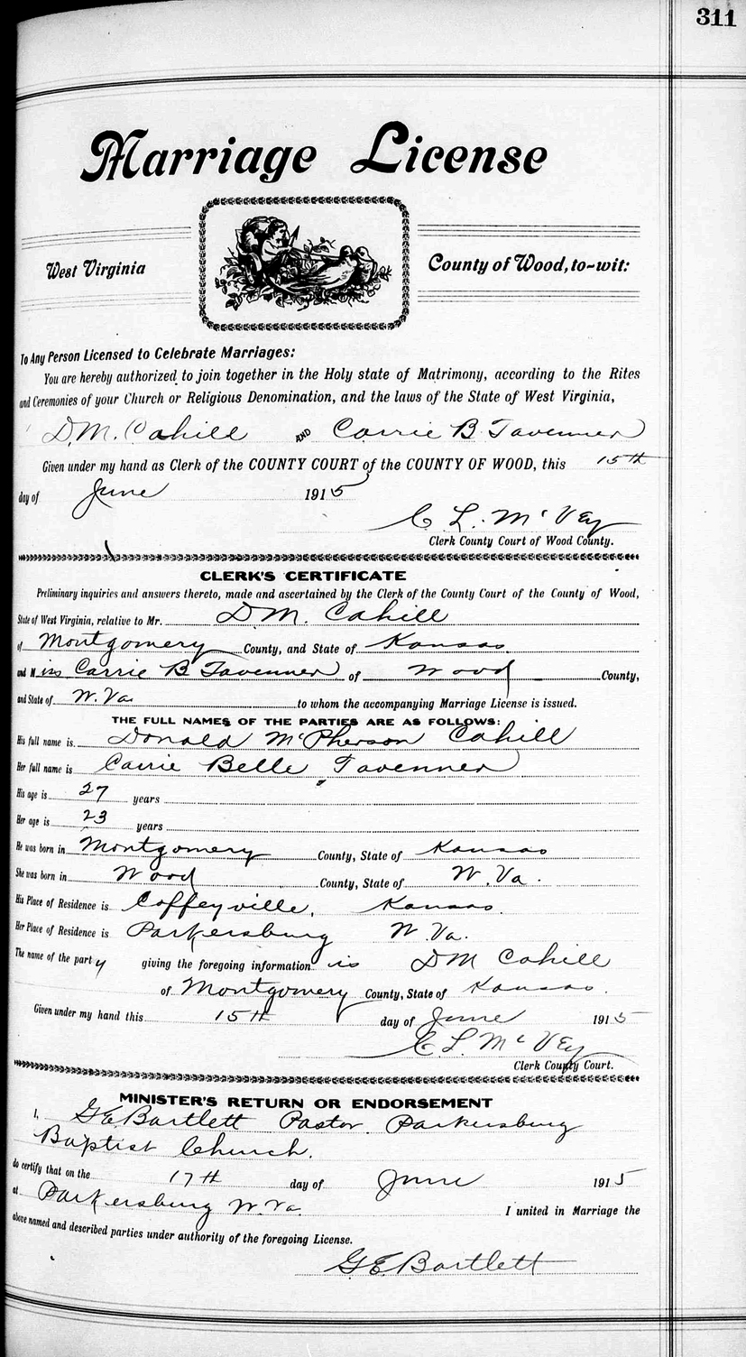 Marriage License of Donald M. Cahill and Carrie Belle Tavenner Marriage Application, License and Minister's Return Form of Donald McPherson Cahill and Carrie Belle Tavenner. Dated and filed on 15 June 1915. Marriage performed on 17 June 1915 by Baptist Minister G. E. Bartlett. |