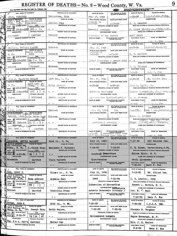 Register of Deaths Book No. 8, Wood County, West Virginia Page 9 - Name: Nettie Garnett Alexander; Residence: 910 Division St., Parkersburg, West Virginia; Date / Place of Birth: 13 Apr 1882, Wood County; Age: 68y; Status: Married; Date of Death: 15 Jul 1950; Date / Place of Burial: 17 Jul 1950, Odd Fellows Cem. |