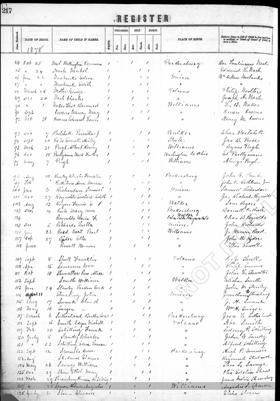 Register of Births Book, Wood County, West Virginia Page 217, Line 127 (left side) - Date: 28 Mar 1878; Name of child: Holmes Augustus Spencer; Place: Williams District; Name of father: Augustus J. Spencer |