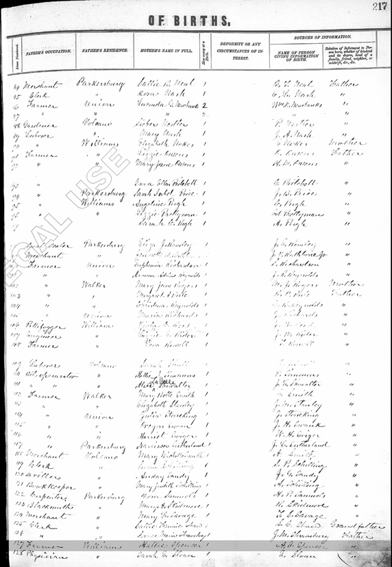Register of Births Book, Wood County, West Virginia Page 217, Line 127 (right side) - Occupation of father: Farmer; Residence: Williams District; Name of mother: Hattie Spencer; Number at birth: 1; Person providing information: A. J. Spencer, Father |