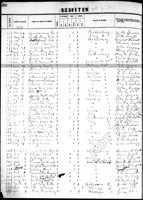 Register of Births Book, Wood County, West Virginia Page 269, Line 284 (left side) - Date: 17 Jun 1883; Name of child: Samuel Spencer; Place: Williams District; Name of father: A. J. Spencer |