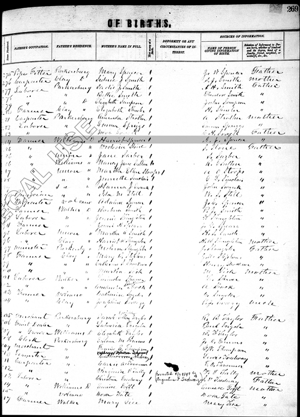 Register of Births Book, Wood County, West Virginia Page 269, Line 284 (right side) - Lists occupation of father: Farmer; Residence: Williams District; Name of mother: Harriet Spencer; Number at birth: 1; Person providing information: A. J. Spencer, Father |