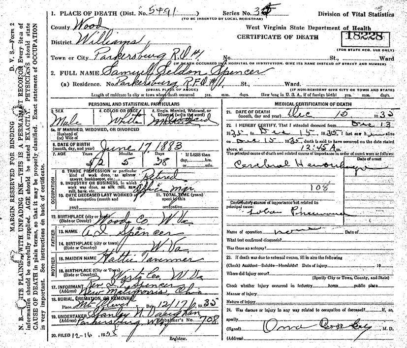 Certificate of Death, Wood County, West Virginia Official Death Certificate of Samuel Selden Spencer |