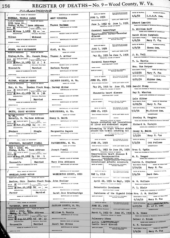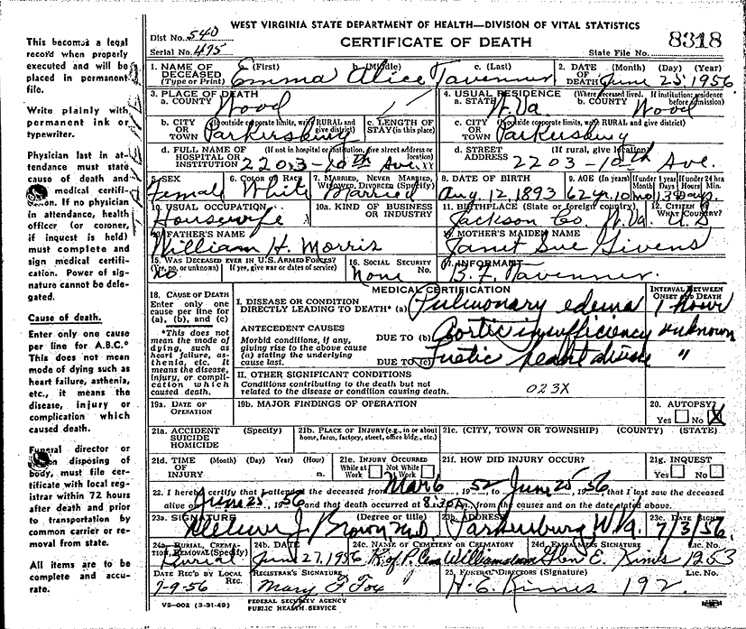 Register of Deaths Book No. 9, Wood County, West Virginia Page 165 - Name: Emma Alice Tavenner; Residence: 2203 10th Ave., Parkersburg, W. V.; Date of Birth: 12 Aug 1893; Age: 62 yrs 19 mo. 13 days; Status: Married; Date of Death: 25 Jun 1956; Date & Place of Burial: 27 Jun 1956, K of P Cem., Williamstown, W. V. |