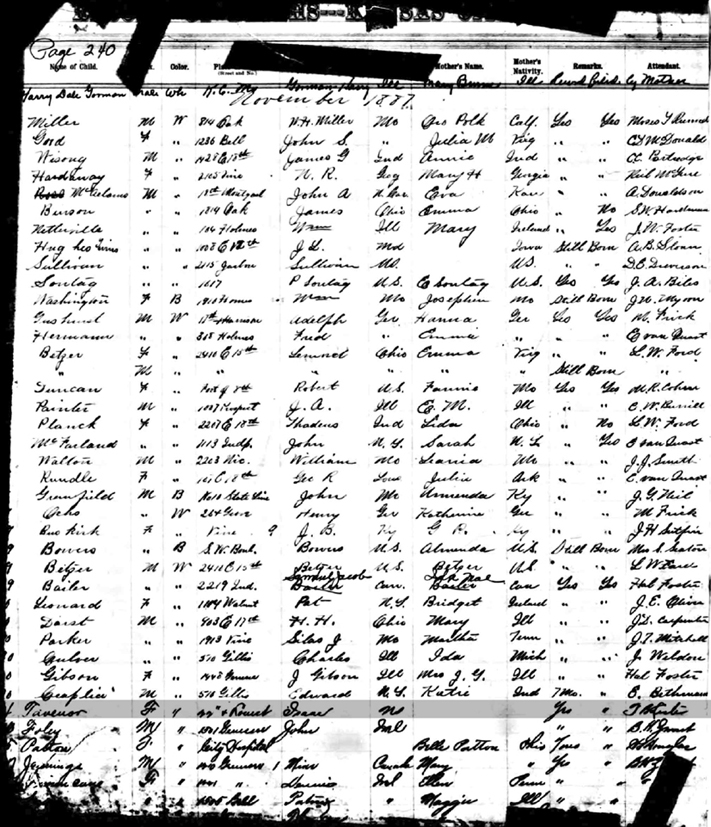 Page 240 – Birth Date: Month: ? Day: 4 (only number visible); Name of Child: ---- Tavenor; Sex: F; Place of Birth: 22nd & Locust, Kansas City; Father's Name: Isaac; Mother's Name: ----.