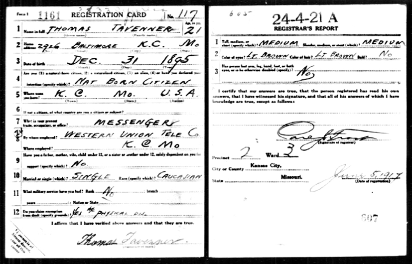 World War I - Military Registration Card Draft Card of Thomas Tavenner. Dated 5 June 1917. |