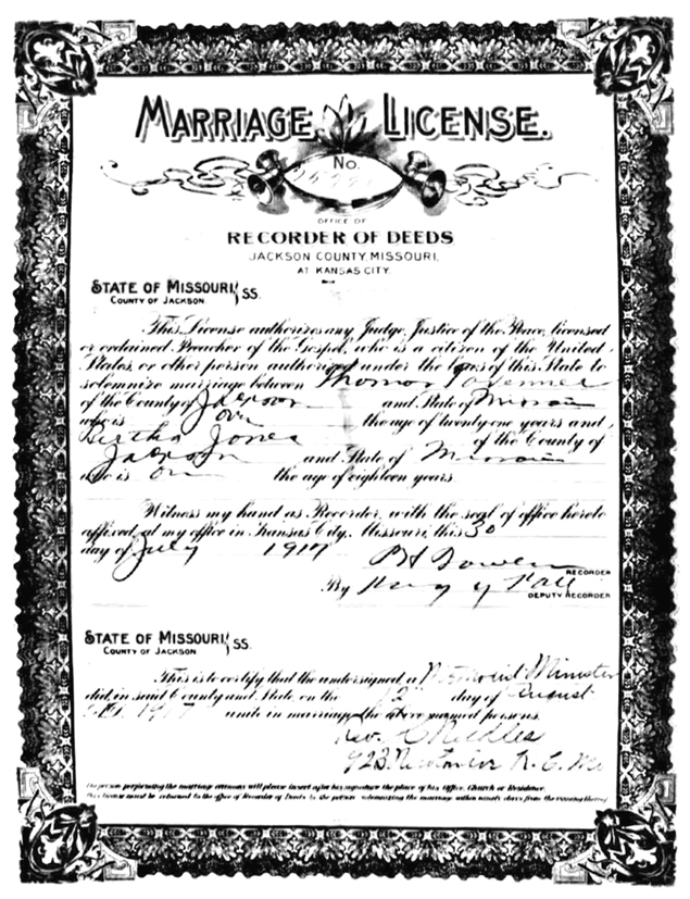 Marriage License – Kansas City, Jackson County, Missouri Marriage License of Thomas Tavenner and Bertha Jones. Dated 30 July 1917. |