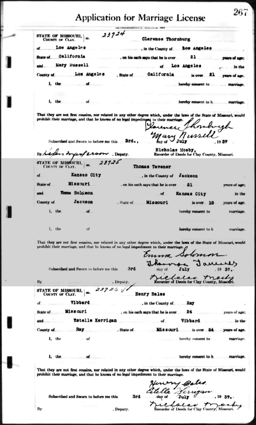 Application for Marriage License Book, Clay County, Missouri Page 267 - Thomas Tavenner and Emma Solomon applied for a Marriage License on 3 July 1937. |