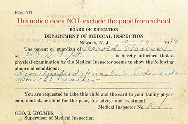 Form 877 -- Front side This document (dated 10 Oct 1919) was given to Harold Tavener by his school's doctor following a medical examination. It indicates that Harold had enlarged tonsils and adenoids. |