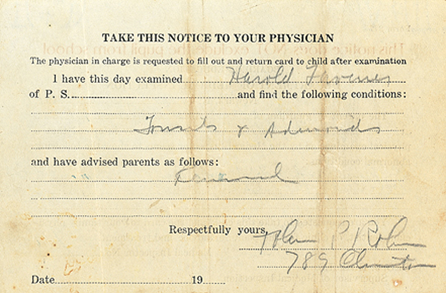 Form 877 -- Back side This side was filled out by the family doctor who recommended removal. Because this document was found in the family Bible – and wasn't given back to the school doctor, one could assume the operation didn't take place. |
