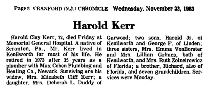 Cranford Chronicle Newspaper Obituary - 23 November 1983 Obituary notice for Harold Clay (Tavener) Kerr. |