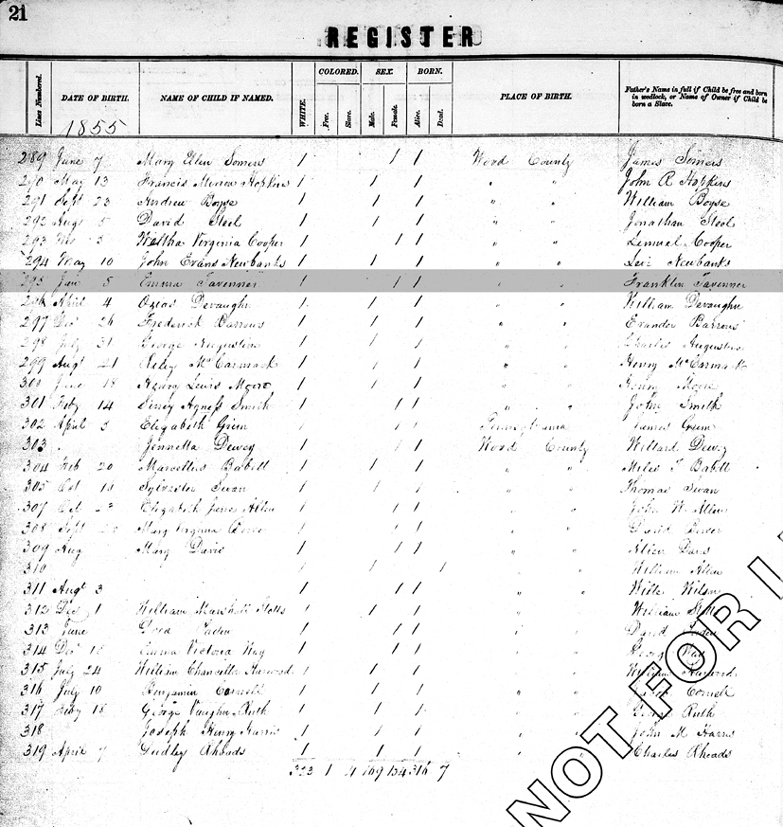 Register of Births Book, Wood County, Virginia Page 21, Line 295 – Lists birth of Emma Tavenner on 5 Jan 1855 |