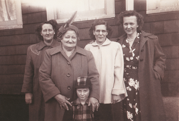 Group photo - Easter 1950, Orange, Essex County, New Jersey Left to right: Ina Mae (Lutze) Carsey, Jennie May (Cubberley) Carsey, Eva Mae [Carsey] Tavener and Estelle [Haduck] Carsey. In front: Harvey John Carsey Jr. |