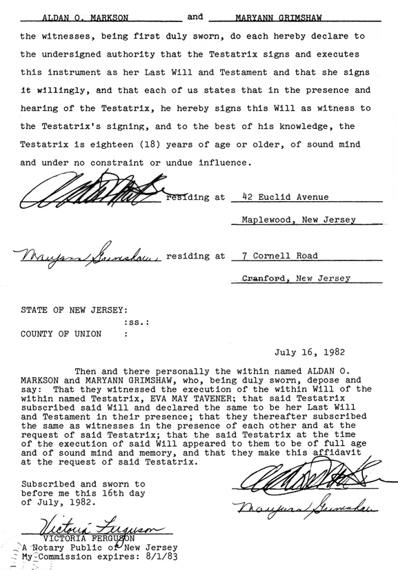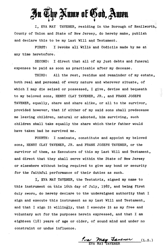 Last Will and Testament of Eva May (Carsey) Tavener Page 1– dated 16 July 1982 |