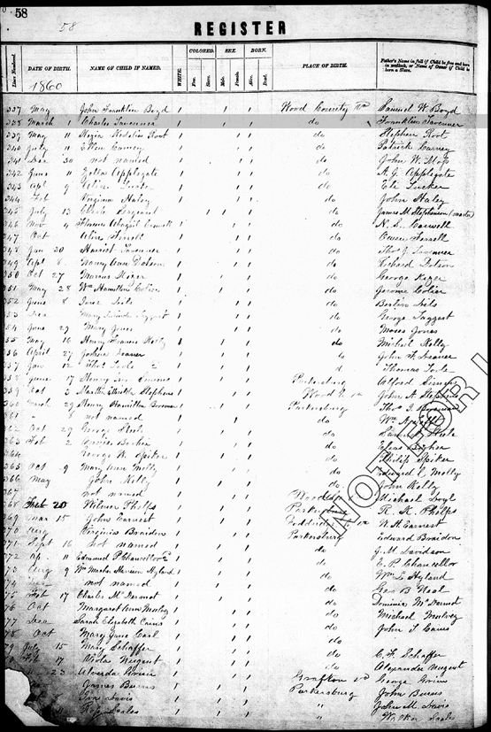 Register of Births Book, Wood County, West Virginia Page 58, Line 338 (left side) - Date: 1 Mar 1860; Name of child: Charles Tavenner; Place: Wood County; Name of father: Franklin Tavenner |