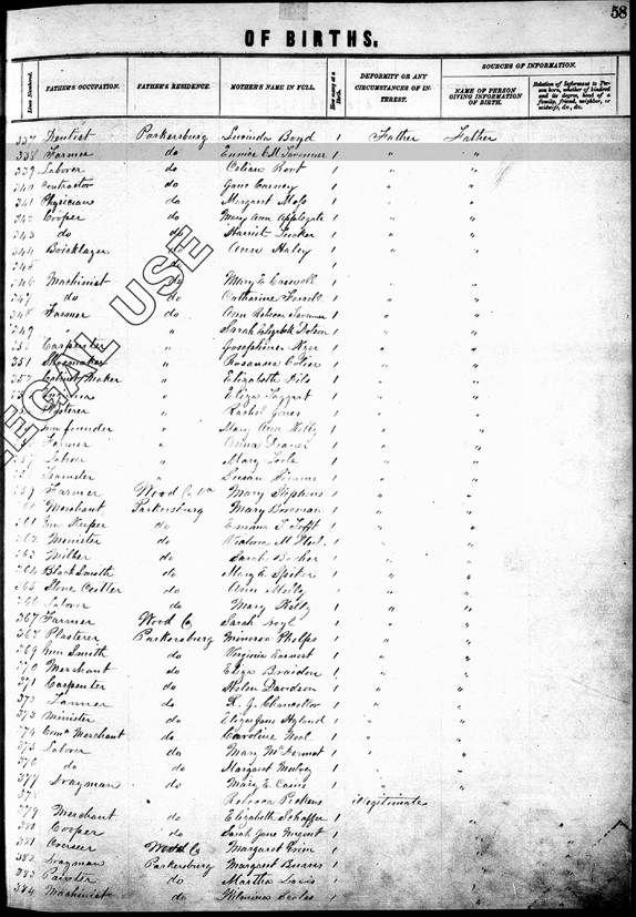 Register of Births Book, Wood County, West Virginia Page 58, Line 338 (right side) - Lists occupation of father: Farmer; Residence: Parkersburg; Name of mother: Eunice C. M. Tavenner; Number at birth: 1; Person providing information: Franklin Tavenner, Father |