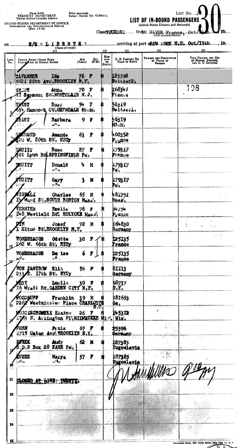 Ida Tavenner listed in the Tourist Class of the S/S "Liberte", departing Le Havre, France, Oct. 12 (?), 1953 and arriving in Port of New York, Oct. 19, 1953.