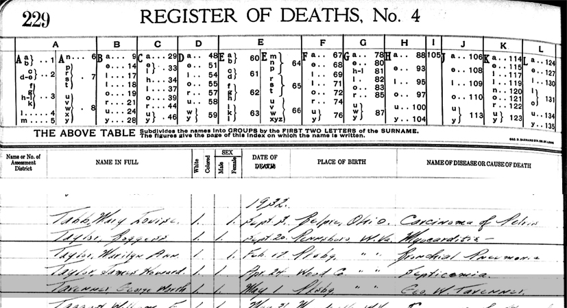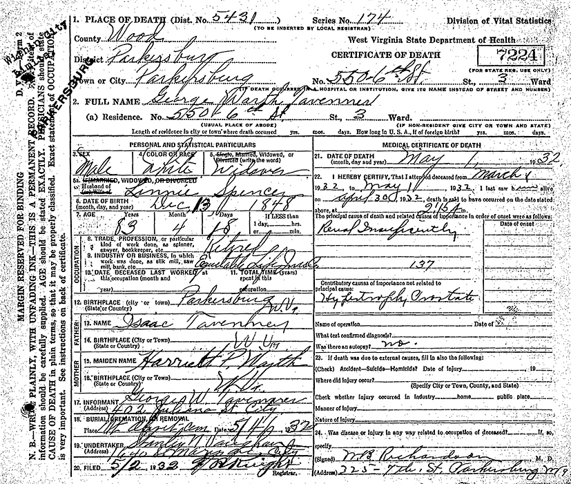 Register of Deaths Book No. 4, Wood County, West Virginia Page 229, (left side) - Name: Tavenner, George Warth; Date of Death: 1 May 1932; Place of Birth: Parkersburg, West Virginia; Name of Disease or Cause of Death: George W. Tavenner (sic) |