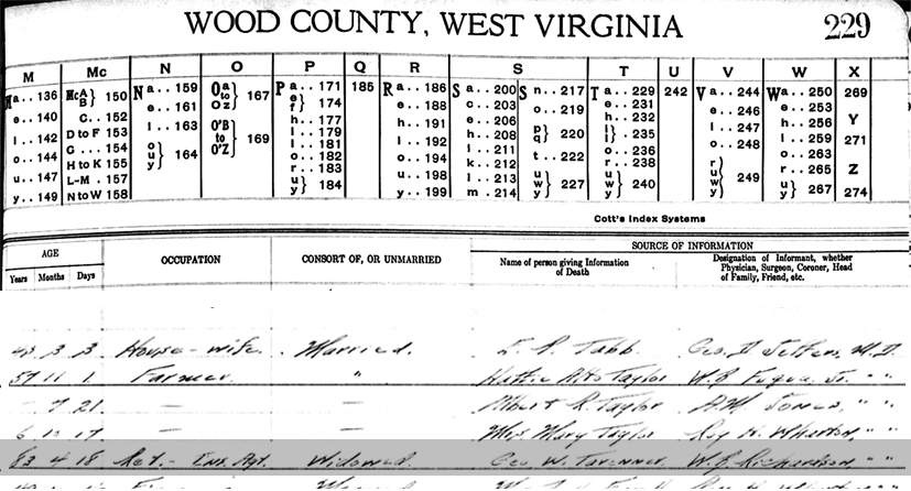 Register of Deaths Book No. 4, Wood County, West Virginia Page 229, (right side) - Age - Years/Months/Days: 83/4/18; Occupation: Retired Insurance Agent; Status: Widowed; Name of person giving Information: Geo. W. Tavenner; Designation of Informant: W. B. Richardson, MD. |