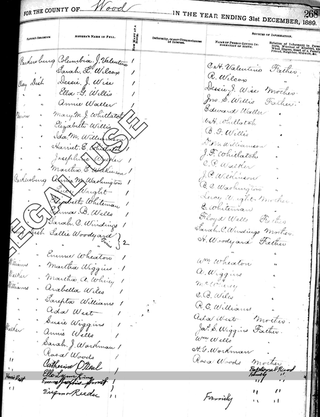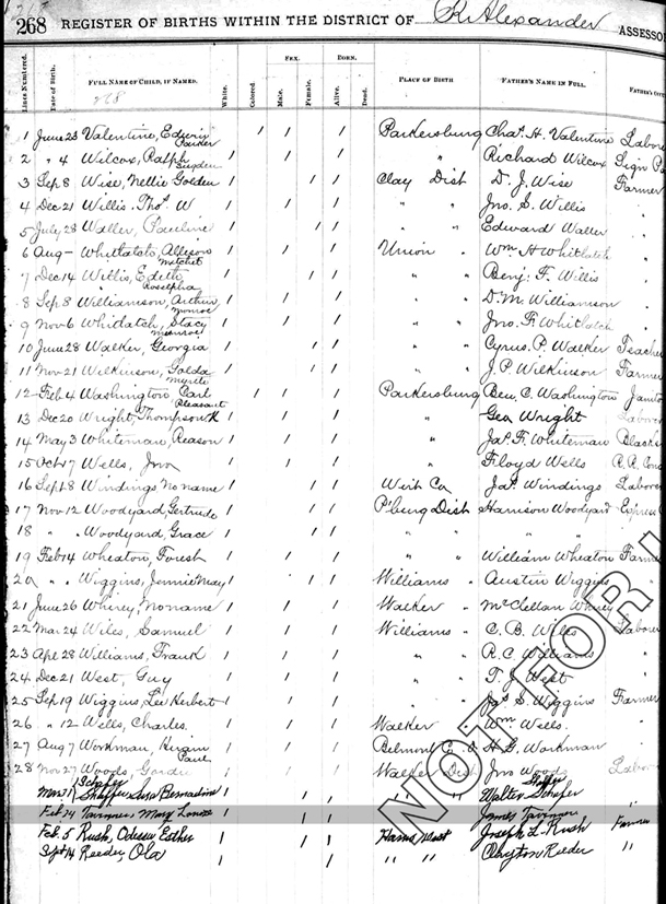 Register of Births Book, Wood County, West Virginia Page 268 (right side) - Residence: Walker District; Name of mother: Ella Lynn Tavenner; Number at birth: 1; Person providing information: Family Record |