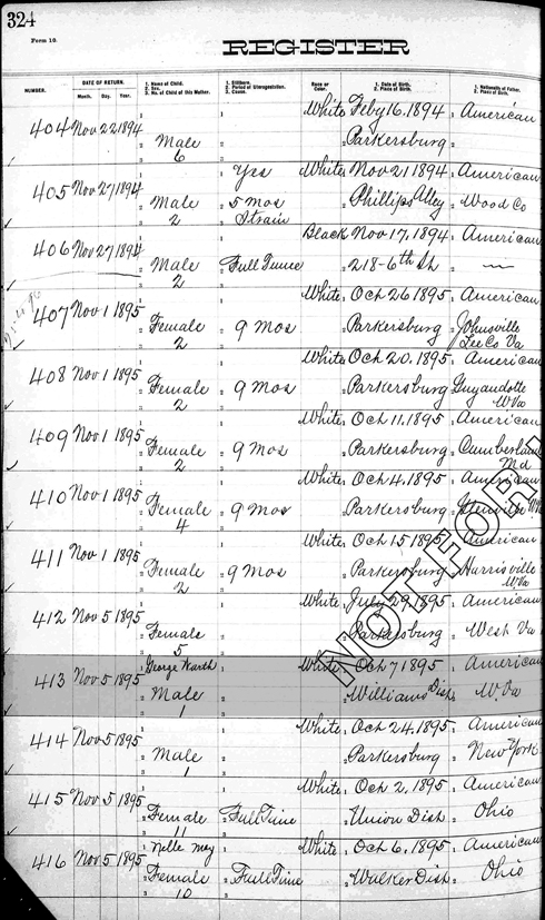 Register of Births Book, Wood County, West Virginia Pages 324-325, Line 413 (left side) - Date of return: 5 Nov 1895; Name of child: George Warth; Sex: Male; Number of child of this mother: 1; Date of Birth: 7 Oct 1895; Place of Birth: Williams District |