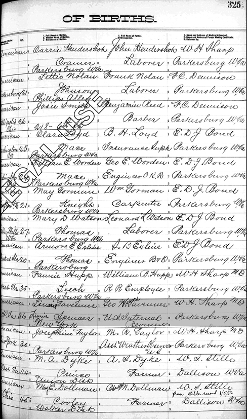 Register of Births Book, Wood County, West Virginia Pages 324-325, Line 413 (right side) - Age of mother: 36; Full name of mother: Linnie Spencer Tavenner; Full name of father: George Warth Tavenner; Occupation: United States Internal Revenue; Name of medical attendant: W. H. Sharp, MD |