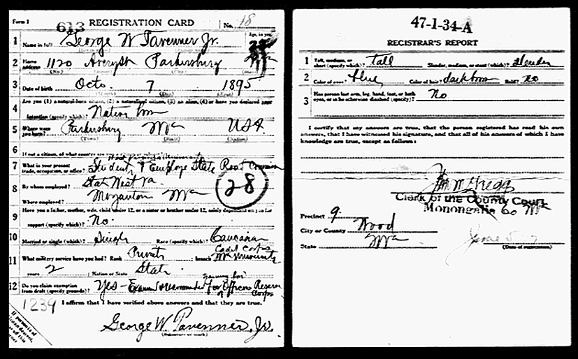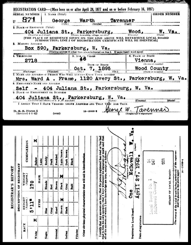 World War II - Military Registration Card Registration Card of George Warth Tavenner Tavenner. |