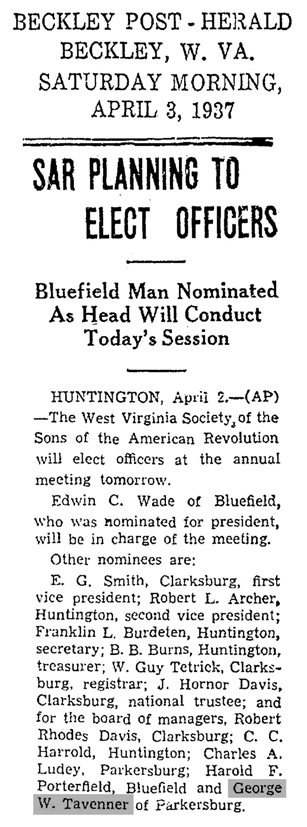 Beckley Post - Herald, Beckley, West Virginia Newspaper article from April 3, 1937. Lists George W. Tavenner as a nominee for the board of managers of the West Virginia Society, of the Sons of the American Revoluton. |
