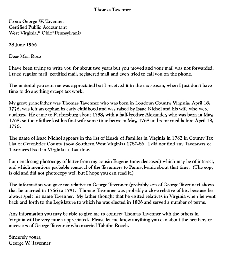 Letter written by George W. Tavenner Copy of a letter written in June 1966 to Lois Rose. Contributed by Lois Rose. |