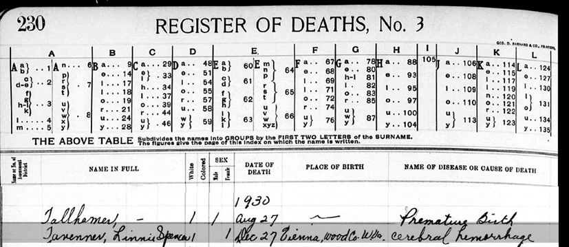 Register of Deaths Book No. 3, Wood County, West Virginia Page 230, (left side) - Name: Tavenner, Linnie Spencer; Date of Death: Aug 27, 1930; Place of Birth: Vienna, Wood County, West Virginia; Name of Disease or Cause of Death: Cerebral hemorrhage |