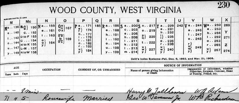 Register of Deaths Book No. 3, Wood County, West Virginia Page 230, (right side) - Age - Years/Months/Days: 71/4/5; Occupation: Housewife; Status: Married; Name of person giving Information: Geo. W. Tavenner Jr.; Designation of Informant: W. B. Richardson, MD. |