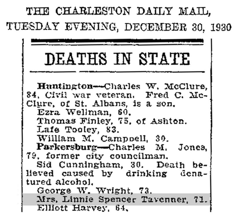Charleston Daily Mail - 30 Dec 1930 Death Notice of Linnie Cass (Spencer) Tavenner. (Image contributed by Lois Rose) |