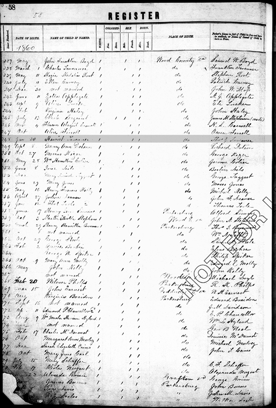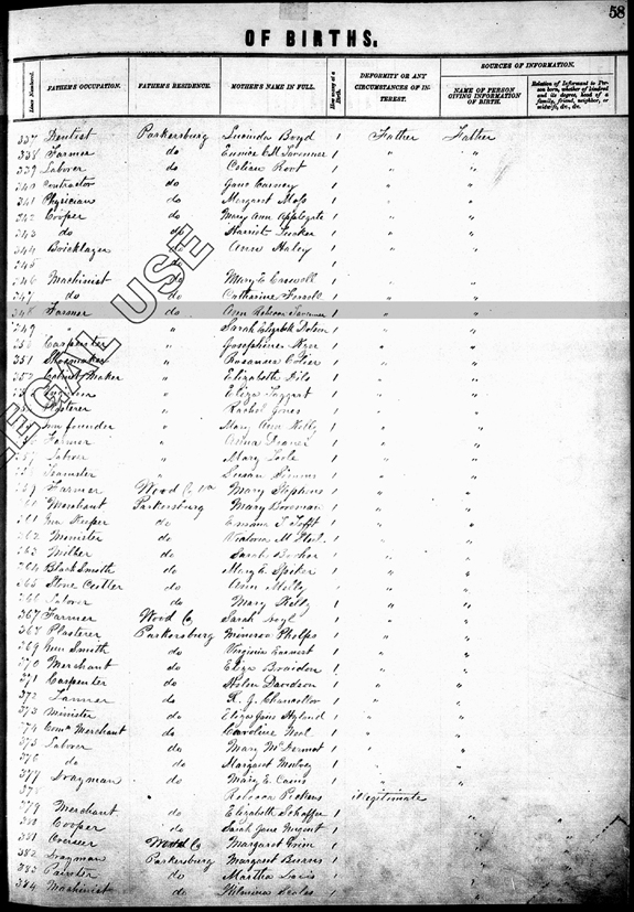 Register of Births Book, Wood County, West Virginia Page 58, Line 348 (right side) - Lists occupation of father: Farmer; Residence: Parkersburg; Name of mother: Ann Rebecca Tavenner; Number at birth: 1; Person providing information: Father |
