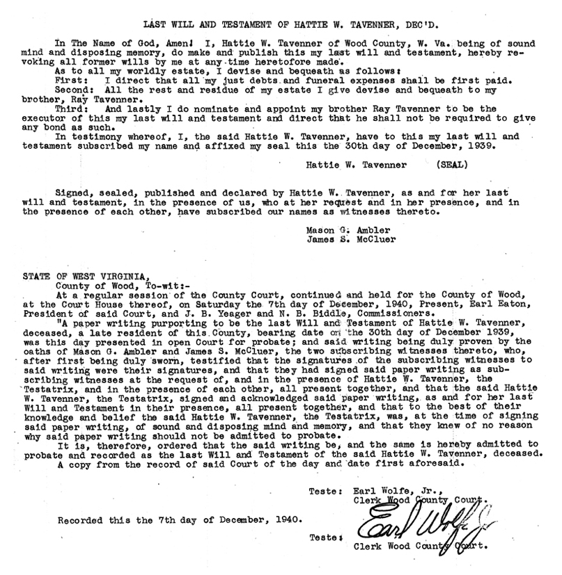 Last Will of Harriet Warth Tavenner Written on 30 Dec 1939 and recorded by the Wood County, West Virginia, County Clerk, on 7 Dec 1940 in Book 15, Page 238. |
